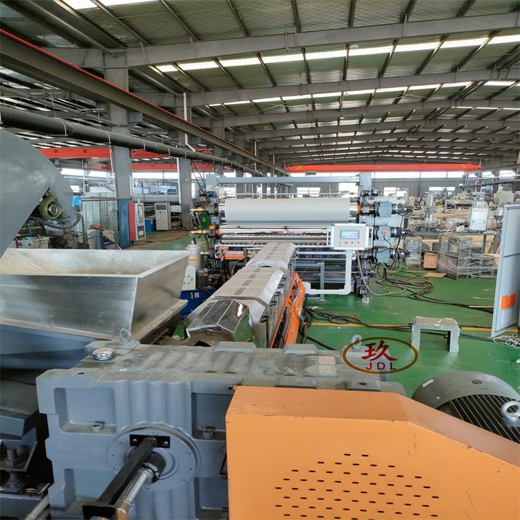 EVA片材擠出設備_EVA隔音氈片材擠出機_EVA隔音毛氈生產線:擠出工藝:不銹鋼料斗----JDL-120單螺桿擠出機------液壓板式換網器---模具接口----熔體泵系統----擠出機模具----三輥壓光機----三輥模溫機------托架冷卻----冷卻牽引切邊裝置----計米器----雙工位收卷機----主機采用:PLC控制加工物料:EVA/POE/EPDM片材l產品要...